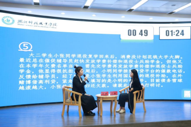 谈心谈话以情景再现的方式开展,主要考察辅导员对谈话主题的理解,对谈话核心的把握,对学生良好沟通关系的建立,以及对具体问题具体分析的相关知识运用等。比赛现场还原了辅导员日常工作中所面临的各类情况,学生或情绪激动,或消极抵制,或百般诡辩,参赛的辅导员们使出浑身解数灵活应对,通过与学生沟通、循循善诱,让学生明德、懂理、知事,彰显了良好的职业素养和温度深度并存的育人真情。