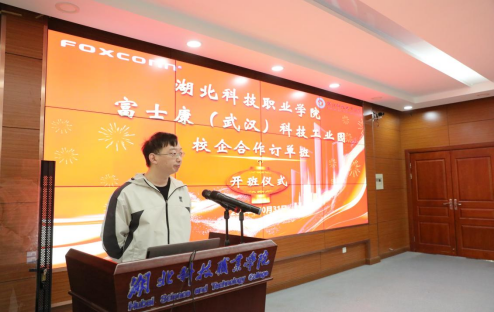 富士康武汉模具单位经理周三要在讲话中点明了模具制造在工业中的核心地位,并分享了富士康在全球范围内的重要地位和广泛合作影响力。他表示,校企合作是一个新的开始,期待未来能够收获丰硕的果实。并勉励同学们尽快完成角色转换,不断深入认识企业,了解行业发展,提高个人专业能力,成为企业未来的工程师与干部。