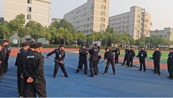 武汉市公安局特警支队许凯警官结合当前社会发生的极端案例和校园安全工作的特点,向队员讲解了门禁管理、校园巡逻等工作任务以及工作中的关注事项,介绍了应对突发事件的措施和方法。在技能培训环节,许凯和特警队员现场讲解示范格斗擒拿技巧要领,演示钢叉、盾牌、警棍等常用器械的正确使用方法,模拟突发事件中三人攻防小组和五人攻防小组的队形演练以及多人攻防配合技能和器械组合使用方法。校卫队队员全程参加,切实感受现场处置要领,有效提升了他们在应对突发事件时的快速反应和实际操作能力,提高了学校安保队伍的综合业务素质。